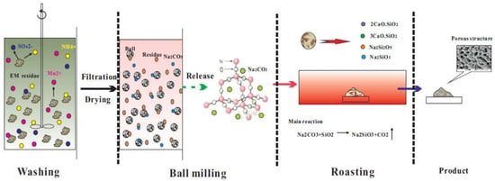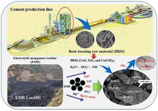 Manganese is a vital material in the national economy and one of the key strategic resources. As the world’s largest producer, China accounts for 94% of global manganese metal output. Electrolytic manganese residue (EMR) is a solid waste byproduct generated during the solid–liquid separation process in the electrolytic production of metallic manganese [1]. For every ton of manganese metal produced, approximately 7 to 9 tons of manganese residue are generated [2]. The accumulation of EMR has exceeded 50 million tons and continues to grow by nearly 10 million tons annually [3,4,5,6]. The predominant disposal method involves extensive landfilling, which leads to the leaching of NH3-N and heavy metals, such as Mn2+, Zn2+, Cu2+, Pb2+, Ni2+, and Co2+ into the soil, thereby contaminating nearby rivers and groundwater. This pollution poses significant risks to local communities and ecosystems. Removing the impurities and curing EMR can enhance its application in traditional industries, such as construction materials. However, these methods are classified as low-value utilization and will cause the waste of resources. Studying the utilization of mineral elements in EMR is critical for sustainable development, including reducing accumulation and mitigating environmental risks [7].