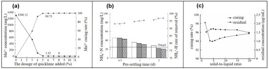 Inert solidification materials, such as cement, are utilized to encapsulate harmful components in EMR and reduce their mobility [10]. This principle forms the foundation of EMR solidification treatment technology [24]. Typically, cement with a minimum content of 45% is used as the primary solidification material [38]. Shu et al. [39] proposed using an alkaline material produced through cement sintering to solidify Mn and NH4+-N, as shown in Figure 4 [39]. Luo et al. [16] mixed quicklime and EMR in a 1:9 mass ratio, pre-stirred the mixture for 40 min, and allowed it to stand for 3 h. The solidification rate of soluble Mn in EMR was 99.8%, while the solidification rate for NH4+-N was 96.73%. The concentrations of Mn and NH4+-N in the solidification leachate were 2.60 mg/L and 21.23 mg/L, respectively, as shown in Figure 5a,b [16]. Zhou et al. [40] added quicklime and NaOH to solidify Mn in EMR and remove NH4+-N. The results indicated that adding CaO was more effective than NaOH in coagulating Mn and removing NH4+-N. The manganese solidification rate and NH4+-N removal rate reached 99.98% and 99.21%, respectively. Pan et al. [41] added Na2SiO4 and utilized saturated clarified lime water to adjust the pH and solidify the EMR. The findings demonstrated that Na2SiO4 significantly influenced the solidification rate of soluble Mn in EMR. Under controlled conditions, the solidification rate of soluble Mn in EMR was 96.8%, and the residual Mn concentration in the filtrate was 0.99 mg/L, as shown in Figure 5c [41].