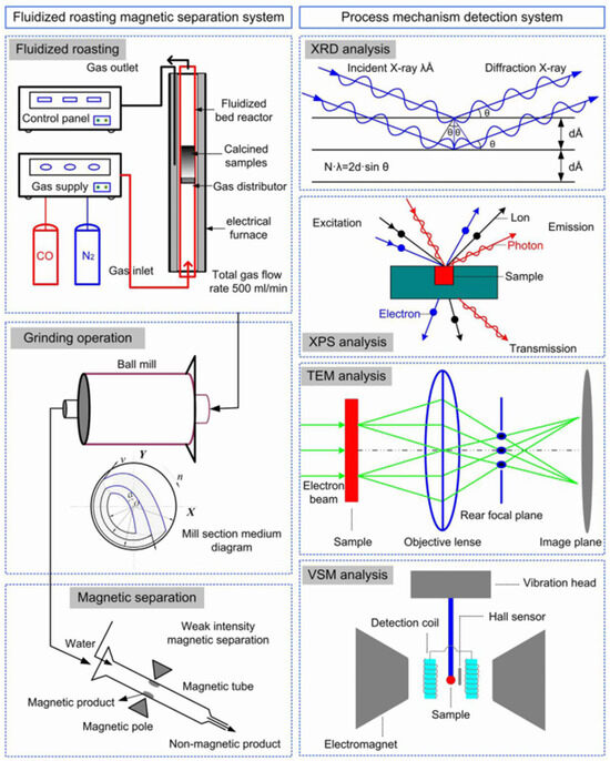 Wang et al. [43] found that pyrometallurgical treatment can minimize pollutants in EMR, ensuring that the heavy metal content complies with national standards. Yuan et al. [44] calcined the EMR at 650 °C for 40 min in an atmosphere of air and CO (the CO concentration of 35%), followed by magnetic separation. In this process, the main useful elements in the magnetite concentrate were the iron element, accounting for 75.47%, while the main useful elements in the magnetite tailings were the manganese element, accounting for 88.75%. The principles of separation and recovery are illustrated in Figure 6 [44]. Sun et al. [45] utilized coke as a reducing agent to recover sulfur from EMR through high-temperature roasting. The S recovery rate from EMR reached 99.7%.