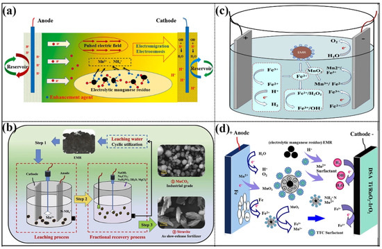 In recent years, electrochemical extraction has been extensively utilized for the extraction of vanadium from converter manganese residue, copper extraction, remediation of heavy metal-contaminated soil, and recovery of manganese from manganese-containing resources [46,47]. Electromigration and electroosmosis are the main mechanisms for the removal of manganese and ammonia nitrogen in EMR. By changing the existence form of impurities through anodic oxidation or cathodic reduction, the ionic strength and porosity are enhanced, which boosts electromigration. Electroosmosis is increased by altering the zeta potential. Shu et al. [47] added EMR into an acid-leaching solution, subsequently adding sodium dodecyl benzene sulfonate, citric acid, EDTA, and other reagents in specific molar ratios. After applying a pulsed electric field for 84 h, the maximum removal rates of Mn2+ and NH4+ in EMR reached 94.74% and 88.20%, respectively (Figure 7a [47]). Tian et al. [13] utilized a leaching solution composed of 9.15 wt.% H2SO4 and 3.33 wt.% H2O2. Under acidic conditions and in the presence of Fe2+, H2O2 catalyzes the generation of hydroxyl radicals (-OH), which possess strong oxidizing capabilities and can significantly enhance the leaching rates of metal ions and NH4+-N. When the current density was set at 35 mA/cm2, the leaching rates of Mn and NH4+-N reached 88.07% and 91.50%, respectively, after 120 min of reaction at 40 °C (Figure 7c [13]). Shu et al. [48] used 13 wt.% H2SO4 as the leachate and applied an external electric field to enhance the process. After a reaction time of 120 min at 20 °C, the leaching rates of Mn and NH4+-N were 89.4% and 65.9%, respectively (Figure 7d [49]). Following the addition of 100 mg/L of TTC and applying an electric field, the leaching rates of Mn and NH4+-N increased to 97.1% and 98.4%.
