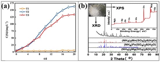 Bioleaching is a process used to extract valuable elements from ores or solid waste. As a recycling technique, it offers significant potential for environmental protection. Duan et al. [52] utilized sulfur-oxidizing and iron-oxidizing bacteria as culture media, using sulfur and pyrite as sources of S and Fe, to bioleach EMR. In this process, EMR is subjected to a sulfur–iron-oxidizing bacterial leaching system for 9 h, resulting in a Mn leaching rate of 99.7%. Lv et al. [53] discovered that Bacillus myxogenes and Bacillus circulans can activate Si and immobilize heavy metal components in EMR. The results indicate that the direct contact efficiency between the bacteria and EMR is high, with an effective Si leaching concentration of 163.27 mg/L (Figure 8a [53]). Most researchers have utilized specific bacterial species for the bioleaching of EMR [52], while others have isolated bacteria from the residue for the leaching process. Lan et al. [54] cultured an EMR suspension for 3–5 days, subsequently purifying and isolating the natural bacterial strain (Y1). They utilized bacteria Y1 along with waste molasses as substrates, successfully recovering valuable elements, such as SO2−, Mg, Mn, Fe, and NH4+, from the residue after 8 days of bioleaching. Through this method, the researchers achieved the recovery of higher-purity (NH4)2Mn(SO4)2·6(H2O), (NH4)2Fe(SO4)2·6(H2O), and (NH4)2Mg(SO4)2·6(H2O) from the leachate (Figure 8b [54]).