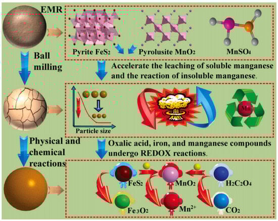 As shown in Table 4, the harmless treatment processes of EMR each have their advantages and disadvantages. Currently, no single process technology can effectively remove all pollutants. Therefore, many researchers have carried out comprehensive harmless treatment processes for EMR to deal with the complex and diverse impurity system. Research has demonstrated that the combination of water and acid leaching significantly enhances manganese recovery. When Lan et al. [57] conducted the ball milling leaching of manganese in EMR, using optimal process parameters, the leaching rate of manganese exceeded 95.56%. During the water leaching process, the addition of dihydrate oxalic acid to the ball mill resulted in a manganese leaching rate of over 98%. The concentration of manganese in EMR after ball milling was below the concentration limit set by the Comprehensive Wastewater Discharge Standard (GB 8978-1996), facilitating the conversion of EMR from Type II solid waste to Type I. The mechanical–chemical-strengthening mechanism for the selective recovery of manganese from electrolytic manganese residue is shown in Figure 9 [57].