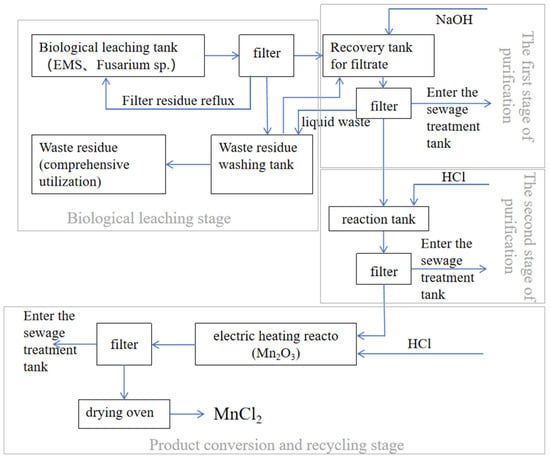 Huang [58] first extracted a significant amount of metal ions from the leaching solution produced from EMR using Fusarium sp. Subsequently, manganese ions were purified and extracted from this solution using NaOH and HCl. The precipitated substance (Mn2O3) was then heated to produce MnCl2, achieving a purity level ranging from over 76% to as high as 93%. This study addresses the limitations of traditional chemical methods for manganese recovery by employing a biological approach, which offers enhanced energy efficiency. Additionally, it mitigates the drawbacks of the microbial leaching process in manganese extraction by incorporating chemical methods, resulting in a relatively straightforward operation. The industrial process flow chart for the biological–chemical recovery of manganese is illustrated in Figure 10 [58].