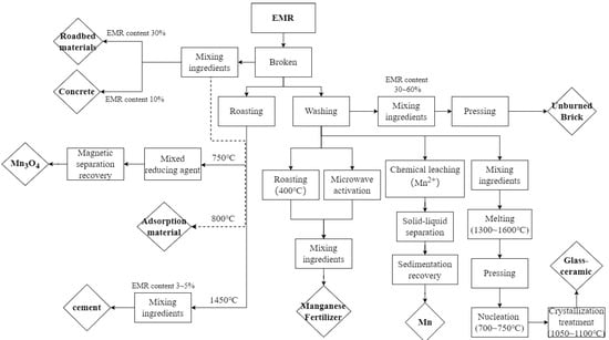 The building materials industry has long served as a primary avenue for the consumption of solid waste. Furthermore, the precious metals found in EMR can be repurposed for valuable applications, including element recovery, manganese fertilizer production, microcrystalline glass manufacturing, and wastewater treatment, as shown in Figure 11. This chapter concludes with a summary of the comprehensive utilization of EMR, as shown in Table 5.