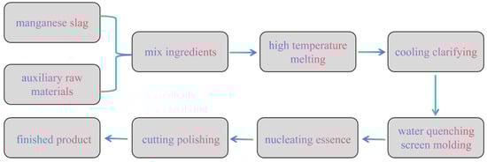 Glass–ceramics are materials characterized by a uniform distribution of microcrystalline and glass phases, exhibiting exceptional properties, such as low density, impermeability, airtightness, high softening temperature, and excellent chemical and thermal stability, as well as mechanical strength and hardness. The main components of EMR are SiO2, CaO, MgO, Al2O3, etc., and it is suitable as the basic raw material for microcrystalline glass. The main process flow is shown in Figure 15. After the steps of melting and water quenching, appropriate nucleating agents (such as TiO2, ZrO2, etc.) are added to control the heat-treatment process, promote the formation of crystal nuclei and crystal growth in the glass liquid, and finally form microcrystalline glass with specific properties. Qian [90] et al. proposed a patented method for producing brown EMR microcrystalline glass using EMR, CaCO3, quartz sand, and MnCO3 through sintering technology. The proportion of EMR can vary from 75% to 99.7% [91]. Liu et al. [92] conducted experiments to prepare microcrystalline glass using the sintering method. DSC/XRD and other performance tests demonstrated that the bending strength of manganese residue microcrystalline glass reached 106.82 MPa, exhibiting good acid and alkali resistance.