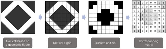 The number of possible structures increases exponentially with the grid definition according to , with n corresponding to the resolution. Because of this, attempting to generate all possible discrete unit cells from high-definition grids is particularly time and resource intensive. Rather than using single elements to generate a new matrix, a column-based method is introduced to construct the basic matrix (Supporting Information Section S1). Appropriate constraints were developed and imposed on the numerical algorithm to reduce by up to 2 orders of magnitude the domain space of the possible matrix permutations.