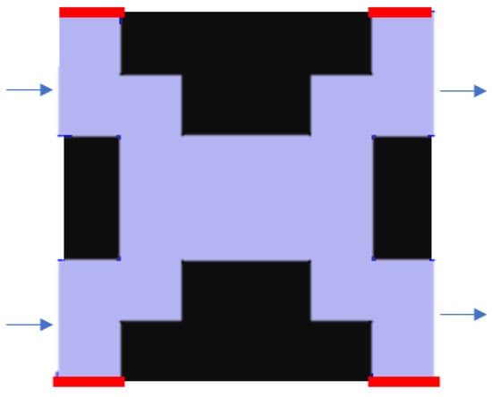 Figure 3 represents a stretch of the setting of boundary conditions, where the blue region is the fluid part and the black region is the solid part. Two kinds of boundaries were applied into the model: no-slip boundary and periodic boundary. The periodic boundaries are used to simulate a column with infinite width [] (red lines in Figure 3). In practice, this corresponds with neglecting the column walls and wall effect. The no-slip boundaries are applied to the fluid–solid interface, where the fluid has zero velocity [,].