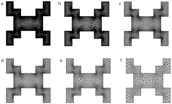 The mesh discretization can be generated by the COMSOL software (version 5.4) automatically. The type and resolution of local details such as corners and boundaries can be altered manually. There are nine levels of the automatically established mesh. Figure 4 illustrates six representative meshes of square pillar configurations, each characterized by two key parameters: (1) average mesh quality, a dimensionless metric quantifying element aspect ratios (with values approaching 1 indicating ideal regular elements) []; (2) total element count across the ten-unit cell column structure. Notably, regions containing irregular geometries frequently exhibit a localized mesh quality below 0.1. Quantitative comparisons of these metrics for different resolution levels are systematically tabulated in Table 3.