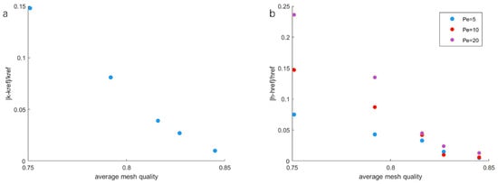 (a) Percentage errors of the permeability to the reference simulation of Figure 4; (b) percentage errors of to the reference. and are the permeability and values of mesh a.