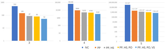 The number of permutations possible in matrices with orders between 3 and 5 generated from the programme under sequential implementation of constraints. NC: no constraints (orange); PP: principal pathway constraint implemented; HS and VS: horizontal and vertical symmetry constraints implemented, respectively; PO: porosity constraint implemented.