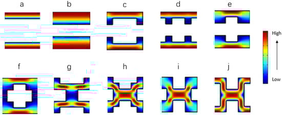 (a–j) Examples of morphologies obtained for a unit X of order 3 (unit M of order 6) with the fluid velocity contours obtained by CFD simulations. The local velocity is normalized against average interstitial fluid velocity. Additional data of meshes are reported in Table 4.