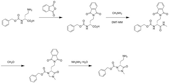 Proposed synthetic pathway of a chiral precolumn derivatization reagent, benzyl 5-(2-aminoethyl)-3-methyl-4-oxoimidazolidine-1-carboxylate (CIM-C2-NH2).