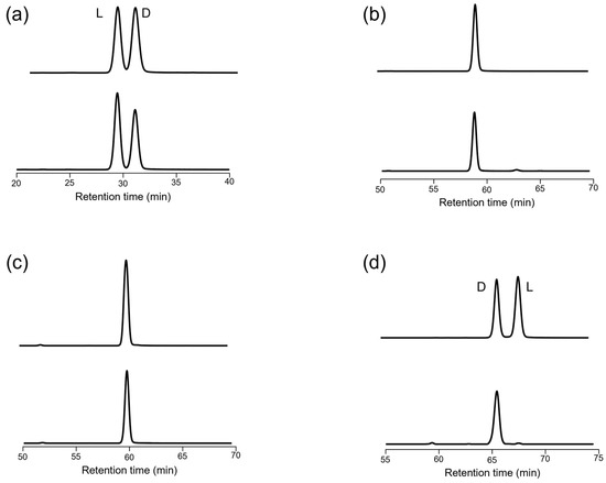 Representative chromatograms of organic acids: (a) lactic acid (LA; d-LA, 200 μM; l-LA, 200 μM), (b) malic acid (MA; dl-MA, 200 μM), (c) succinic acid (SA; 200 μM), and (d) citramalic acid (CMA; d-CMA, 200 μM; l-CMA, 200 μM). Upper panel: organic acid standard; lower panel: organic acid detected in sake A.