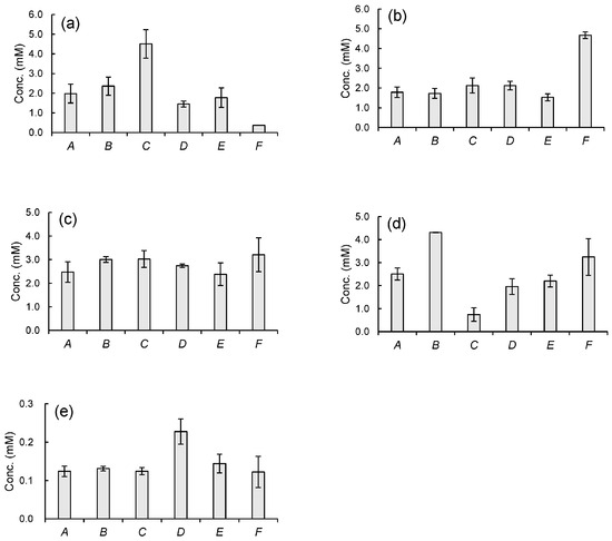 Concentrations of organic acids (a) l-LA, (b) d-LA, (c) SA, (d) MA, and (e) d-CMA in commercial sakes A–F. Data are expressed as mean ± standard deviation from three independent bottles of each sake.