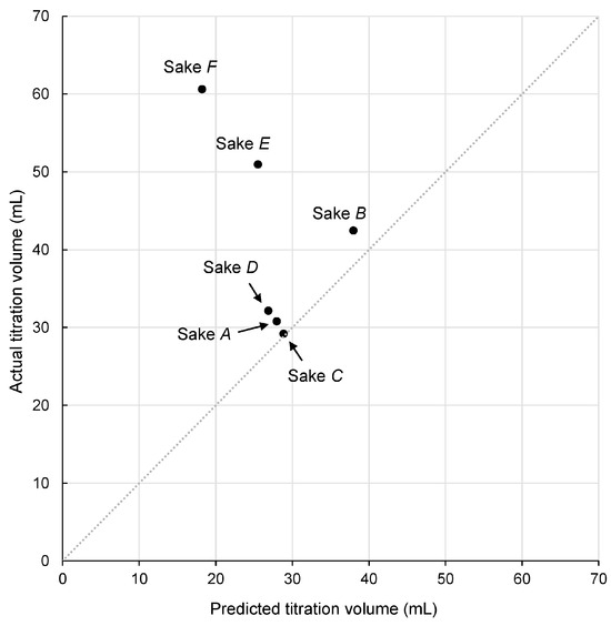Correlation plot between actual titration volume (vertical axis), determined by neutralization titration, and predicted titration volume (horizontal axis), calculated from the sum of organic acid (l-LA, d-LA, SA, MA, and d-CMA) concentrations determined by liquid chromatography–tandem mass spectrometry (LC-MS/MS) in commercial sakes A–F.