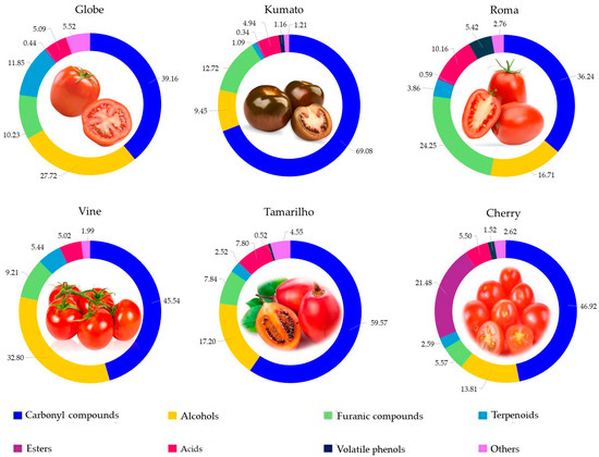 Figure 1 displays each chemical family’s contribution to each tomato variety’s total volatilomic fingerprint. Carbonyl compounds were the main chemical family of VOCs, contributing on average 47.5% for S. lycopersicum L., 46.9% for S. lycopersicum var. cerasiforme (Cherry), and 59.6% for S. betaceum (Tamarilho). The second most representative chemical family for the total volatilomic fingerprint of each tomato variety was alcohols for Vine (33%), Tamarilho (17%) and Globe (28%), esters for Cherry (21%) and furanic compounds for Kumato (13%) and Roma (24%).