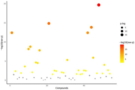 A total of 55 VOCs were identified in the tomatoes investigated and their GC peak area (GC-MS data set) was normalised using cubic root transformation and autoscaling. After that the one-way ANOVA, followed by post hoc Tukey’s test at p < 0.05 that was performed to select the VOCs that have statistically significant differences. As can be observed in Figure 2, 23 VOCs do not show significant differences among tomato varieties, hence why they were eliminated for subsequent statistical analysis.