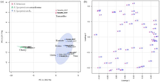 PCA of the volatilomic fingerprint of the tomato varieties (n = 3 for each data point): (a) score scatter plot and (b) loading weight plot. Consult Table 1 to see the numbers that correspond to the VOCs.