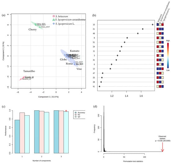 The PLS-DA scatter plot data indicates that the samples were distributed on the first two principal components (PC1 and PC2), reflecting on a 64.8% total variance (PC1: 31.8%, PC2: 33%) (Figure 4a), effectively separating the tomato varieties. As can be observed in Figure 4b, 15 differently expressed VOCs presented VIP scores ≥ 1, namely 2-pentylfuran (#10), nonanal (#21), phenylethyl alcohol (#48), 3-methyl-1-butanol (#8), 2,5-furandicarboxaldehyde (#51), (E)-2-octenal (#24), 1-pentanol (#11), hexanal (#3), (E)-2-nonenal (#31), and heptanal (#6). These VOCs are considered to be the most relevant that discriminate and differentiate the tomato varieties, highlighting them as potential characteristic molecular biomarkers. The permutation test confirms the statistical significance of the model (p = 0.036), validating that the separation observed is not due to random chance. The observed statistic (red arrow) lies well outside the distribution of permuted values, supporting the model’s robustness (Figure 4d).