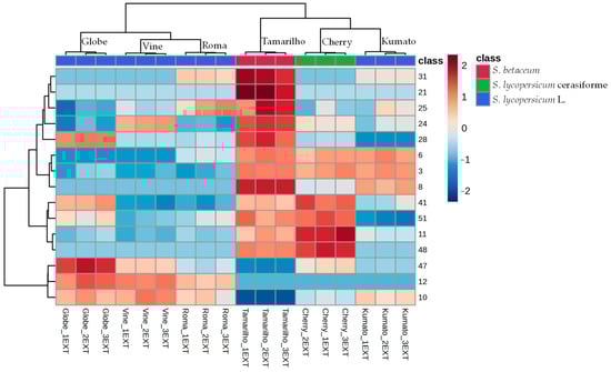 HCA and heatmap of the putative characteristic molecular biomarkers identified in tomato varieties. Consult Table 1 to see the numbers that correspond to the VOCs.
