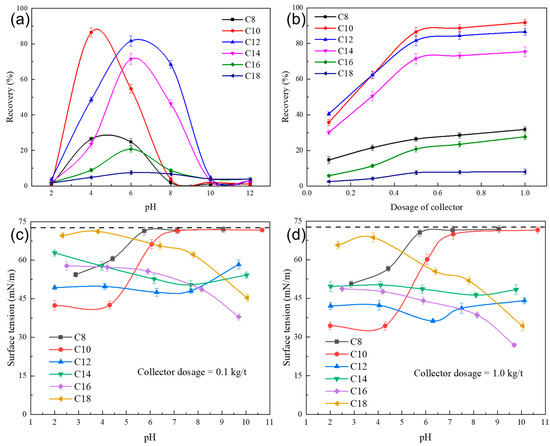 Flotation recovery of ilmenite (a) as a function of pH using a series of saturated acids as the collector at a fixed dosage of 0.5 kg/t and (b) as a function of the collector dosage at the optimum pH of each (pH = 4 for C8 and C10; pH = 6 for C12, C14, C16, and C18); surface tension as a function of pH (c,d) using saturated acids as the collector (dashed line—surface tension of pure water).