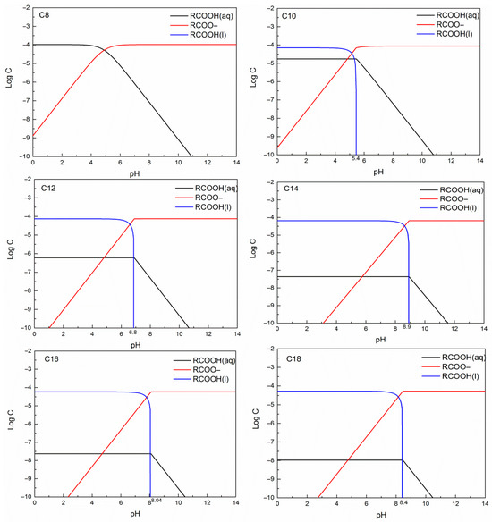 According to previous reports, undissociated acids, ions, dimers, and acid-soap complexes are generally considered to be the active species present in fatty acid systems [10,45,46]. Which of these species acts as the main functional species depends on the pH value and the collector concentration. Studies have shown that, as ion-molecular species, acid-soap complexes (RCOOH·RCOO−) are larger surfactants with high surface activity because of the increase in molecular size and their low intrinsic solubility [10,31,38]. In general, the amount of acid-soap complex reaches a maximum around the pHeq, near which RCOOH(aq) and RCOOH(l) can form a saturated solution (which is closely related to the solubility and pKa values of the fatty acids) [31,46]. However, most previous studies have focused on the solution chemistry analyses of unsaturated fatty acids, and little information is available on the series of saturated fatty acids. To provide a better understanding, the combined solution chemistry diagrams of the series of saturated fatty acids examined in this work were calculated, and the results are shown in Figure 3. The basic data used for solution chemistry analyses, such as pKa and solubility values, were obtained from Quast’s study [11]. Furthermore, only one-stage hydrolysis was considered while creating Figure 3; thus, dimers and acid-soap complexes are not shown. In general, if dimers and acid-soap complexes are present in the solution, they would reach their maximum concentration at pHeq; therefore, the solution chemistry diagrams in Figure 3 could be used for qualitative analyses.