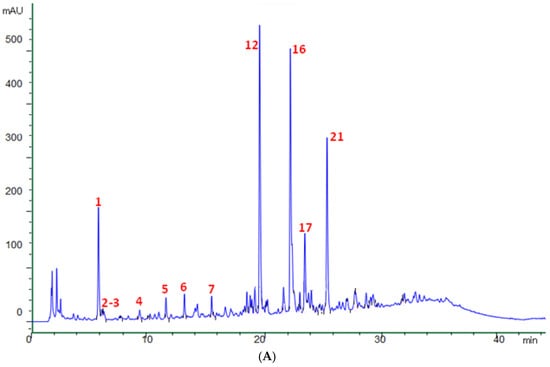 For the chromatographic analyses, a 1260 Infinity II LC system coupled with a DAD and a Mass Spectrometry Detector (InfinityLab LC/MSD) using an API/ESI interface (Agilent Technologies, Palo Alto, CA, USA) was employed. Chromatographic separation was performed on a Poroshell 120 EC-C18 column (150 mm × 3.0 mm, 2.7 µm particle size; Agilent, Palo Alto, CA, USA). The mobile phase consisted of HPLC-grade acetonitrile (solvent A) and ultrapure water acidified with 0.1% formic acid (solvent B). A linear multistep gradient elution was applied at a constant flow rate of 0.4 mL/min. The gradient profile was as follows: solvent B decreased from 95% to 60% over 40 min, held at 60% for 5 min, reduced to 0% over the next 5 min, maintained at 0% for 3 min, and then returned to 95% within 2 min, making the total run time 55 min. The injection volume was 2 µL, and the system was equilibrated for 10 min prior to each run. UV-Vis spectra were recorded from 200 to 550 nm, with chromatograms monitored at 210, 220, 240, 280, and 350 nm.