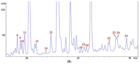 Chromatographic profile at 280 nm (A) and zoom of the central part of the chromatogram (B) of a representative olive leaf extract (OLE).
