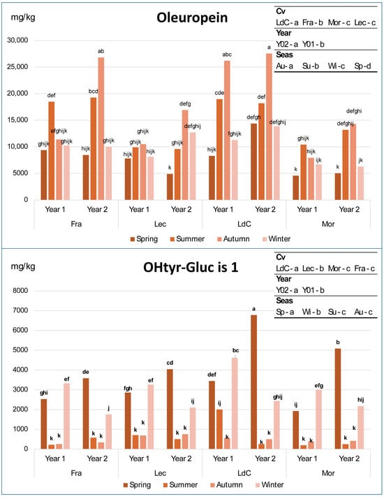 Variation in oleuropein and hydroxytyrosol–glucoside isomer 1 in olive leaf samples of the 4 cultivars across years and seasons. Fra, Frantoio; Lec, Leccino; LdC, Leccio del Corno; Mor, Moraiolo; Sp, spring; Su, summer; Au, autumn; and Wi, winter. In each graph, different letters over the bars indicate significant differences within each single sample at p < 0.05, while different letters in the top-right box indicate significant differences within each individual factor at p < 0.05, resulting from 3-way ANOVA and Tukey test.