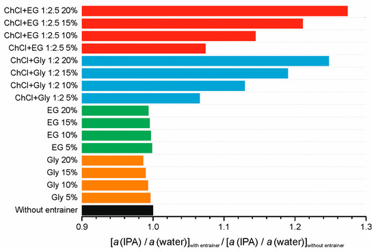 Ratio of activity of IPA and water in the system with an entrainer, divided by the same ratio in the system without an entrainer, as calculated by the COSMO-RS model at 80 °C. IPA—isopropanol; ChCl—choline chloride; EG—ethylene glycol; Gly—glycerol.