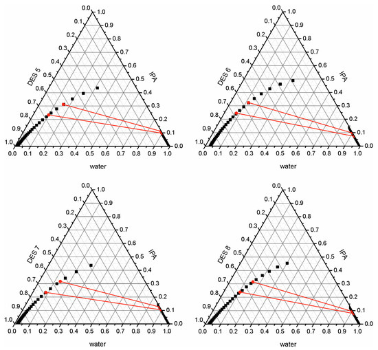 Ternary plots in mass fractions, showing the liquid–liquid equilibria phase diagrams, with two-phase regions bordered by the black squares and tie lines corresponding to the experiments in red, as calculated by the COSMO-RS model at 25 °C.