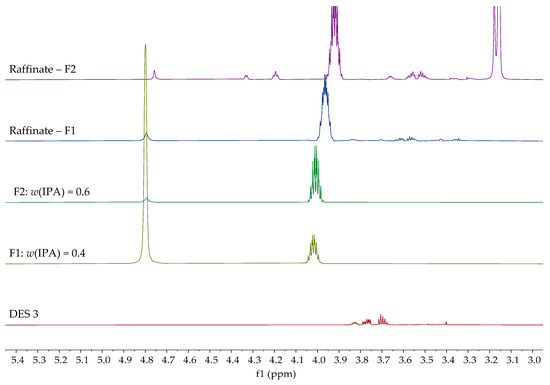 Since water is more polar than IPA, it was expected that the hydrophilic DESs would extract water preferentially. Of the two hydrophilic DESs, DES 4 was completely miscible with both feed mixtures, while DES 3 promoted phase separation, contrary to the COSMO-RS prediction. However, the measured refractive indices of the raffinate phase were higher than the maximum possible value for a solution of IPA and water, indicating partial miscibility of the phases. To confirm the presence of DES 3 in the raffinate phase, 1H NMR spectra were measured; the spectra obtained are shown in Figure 3. The signals characteristic of DES 3 (multiplet from 3.67 to 3.87 ppm) are clearly visible in the enlarged spectra of both raffinate phases. Upfield shifts of these signals in the raffinate spectra, compared with DES 3, indicate changes in solvent environment, concentration, or subtle conformational changes that increase local electron density. This shift is more pronounced in feed solution with higher IPA concentration.