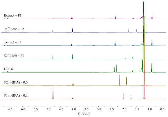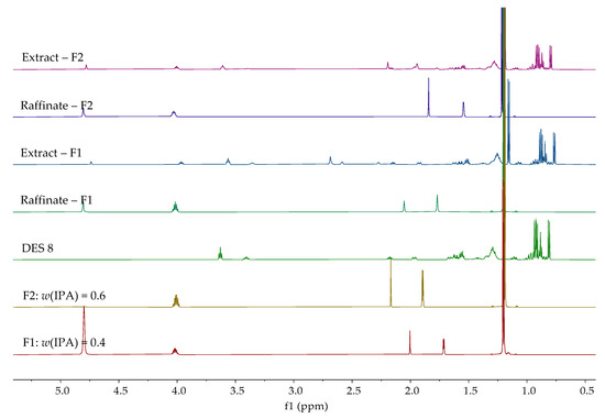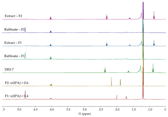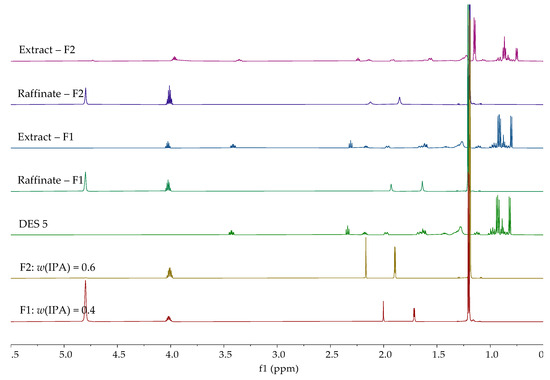 To investigate whether hydrophobic DESs are soluble in feed solutions, 1H NMR spectra of DESs, feed solutions, raffinate, and extract phases were measured, and the spectra obtained are shown in Figure 4, Figure 5, Figure 6 and Figure 7. Since IPA is less polar than water, it was expected that IPA would be extracted by hydrophobic DESs. The successful extraction of IPA from the aqueous phase is indicated by the presence of IPA signals and the expected reduction in water signal (4.7 ppm in Figure 4) in both extracts. The signals characteristic of DES 5 are not visible in the raffinate spectra, confirming the assumption that DES is not soluble in the feed solutions. This is in agreement with COSMO-RS predictions, where mass fractions of DES lower than 0.0021 were calculated. In addition, the relative intensity of the water signal is higher compared with the other IPA signals, indicating that the IPA concentration was significantly reduced. The upward shift of the hydroxyl protons of water and IPA (in the range of 1.2 to 2.2 ppm) in both raffinates compared with the chemical shifts in the feed solutions indicates a reduction in hydrogen bonding in the raffinate. In the feed solutions, IPA is dissolved in water due to the strong hydrogen bonding between IPA and water molecules. The DES itself is formed by strong hydrogen bonds between its components. When DES is added to the feed solution, a highly interactive environment for IPA is created as both DES components can act as HBD and HBA. By establishing a subtle balance of hydrogen bonding and hydrophobic interactions between IPA and DES, IPA is effectively extracted from water. The DES components, particularly the acidic proton of decanoic acid, provide an energetically favorable environment for hydrogen bonding, while the hydrophobic parts of DES components can accommodate IPA molecules’ hydrocarbon chains, so IPA interacts preferentially with DES. Similar considerations can be applied to the 1H NMR spectra of other hydrophobic DESs.