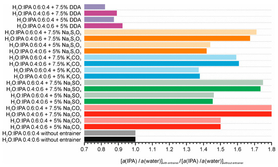 The results related to extractive distillation were calculated by the activity coefficient routine and are presented in terms of the ratio of activity of IPA and water in the system with an entrainer, divided by the same ratio in the system without an entrainer (Figure 1). The temperature was set to 80 °C to comply with the experimentally investigated range.