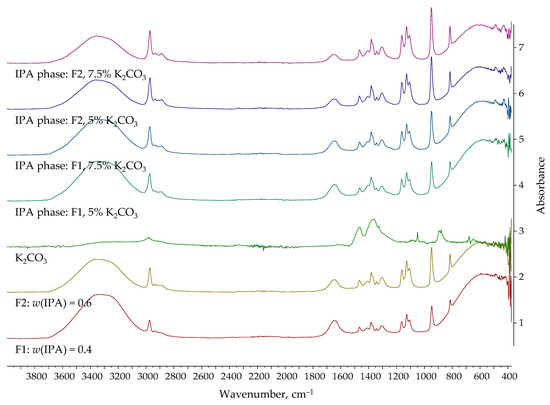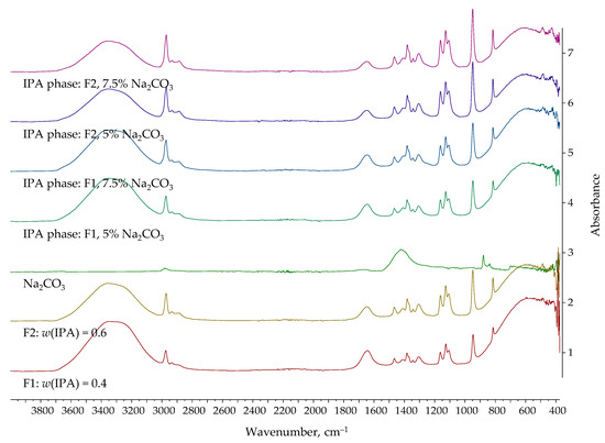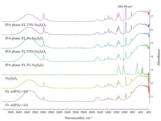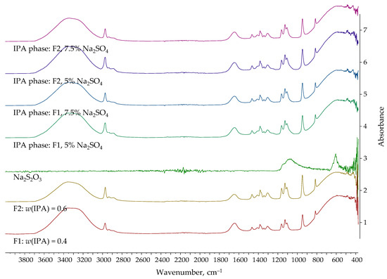 FTIR spectra of feeds, Na2S2O3, aqueous, and 2-propanol (IPA)-rich phases.