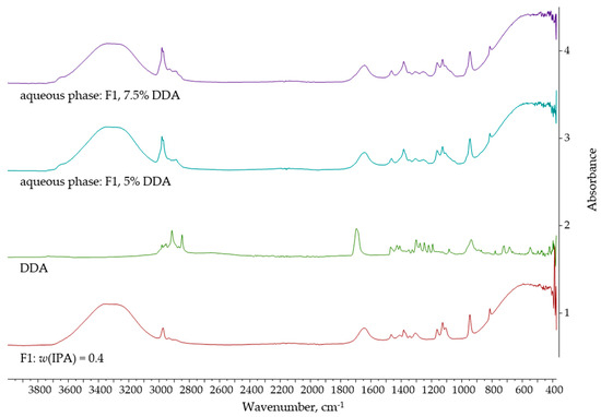 FTIR spectra of feed, dodecanoic acid (DDA), aqueous, and 2-propanol (IPA)-rich phases.