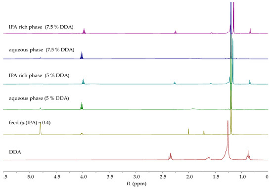1H NMR spectra of feed, dodecanoic acid (DDA), aqueous, and 2-propanol (IPA)-rich phases.