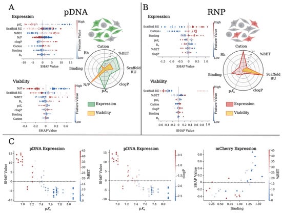 The SHAP values for physicochemical features related to expression and cell viability when delivering (A) pDNA or (B) RNP. Higher SHAP values correlate with higher impact on the output variable. The feature value color bar corresponds to the normalized value of the feature of interest (where low = blue; moderate = white; and high = red). Each dot represents a polymer formulation. (A) An overlay spider plot showing the average impact of individual polymer variables on expression and viability when delivering (A) pDNA and (B) RNP. The spider web plot is constructed by taking the mean SHAP value for a given feature across all samples and normalizing to the maximum SHAP value for each output variable. (C) SHAP dependency plot values across two variables relating to expression [121].