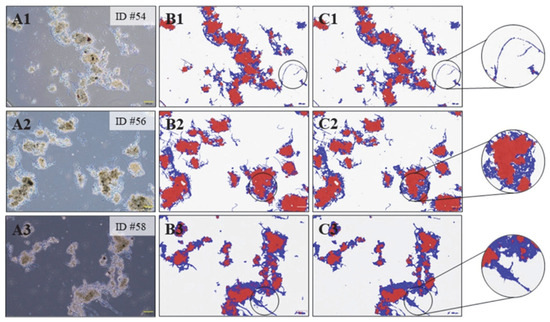 Validation results: raw microscopic images (A1–A3), ground truth (B1–B3), and deep learning model output (C1–C3). Mask colors indicate floc-forming bacteria (red), filamentous bacteria (blue), and background (white), with a yellow scale bar of 100 μm [128].