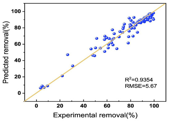 A scatter plot of the predicted heavy metal removal efficiency and experimental data using the RF model [131].