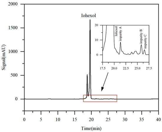 Figure 2 displays the HPLC chromatogram of iohexol crude solution. The primary component, iohexol, constituted 95.86% of the total peak area. Target impurity A was eluted at 21.4 min with a content of 0.36%, while target impurities B and C were eluted at 25.8 min and 26.5 min, with contents of 0.35% and 0.15%, respectively.