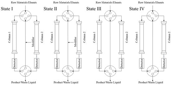 A modifier with lower elution strength than the mobile phase is continuously introduced between the two columns to induce band compression, counteracting band broadening. If the raw materials contain strongly retained components, they can be eluted separately out of the upstream Column 1 or 2 using a strong eluent under State III or IV, respectively, depending on whether the target compounds are eluted from Column 1 to 2 or from Column 2 to 1.