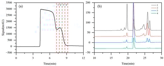 Taking into account both the solubility of the raw material and the chromatographic retention characteristics of the analytes, acetonitrile/water (8:92, v/v) was preliminarily selected as the eluent, with purified water serving as the modifier. To determine the elution order and retention behavior of the components on the semi-preparative column, a single-column operation was first conducted under State III. A 1 mL aliquot of the iohexol crude solution was injected and subsequently eluted with acetonitrile/water (8:92, v/v) at a flow rate of 5 mL·min−1. Four fractions (labeled 1–4) were collected at the column outlet based on the UV detector response (Figure 4a). Further HPLC analysis of these four fractions revealed that iohexol was effectively separated from the later-eluting impurities (Figure 4b). The main component, iohexol, was predominantly eluted before 7.2 min, while the target impurities were detected between 7.2 and 9.2 min. Based on these results, the TCRC operating conditions were preliminarily set as follows: an eluent flow rate of 5 mL·min−1 and a valve switching interval of 10 min (>9.2 min), ensuring complete transfer of all target impurities from the upstream column to the downstream column during each switching cycle.