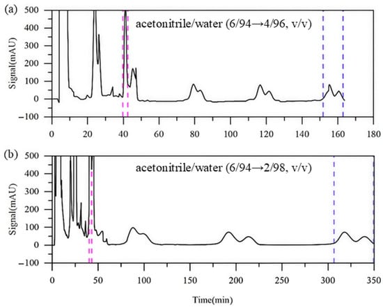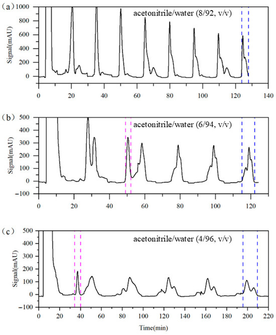 In Run 4, the second-step eluent contained 96% water. As shown in Figure 7a, impurity A was collected during the second switching cycle with a purity of 97.93%, which exceeds that achieved in Run 3 during its first switching cycle. The purities of impurities B and C remained largely unchanged. However, the overall run time was reduced to 162 min, which is significantly shorter than the 210 min required in Run 3. This indicates that the stepwise elution strategy can effectively reduce the solvent consumption without compromising the separation quality. In Run 5, the water content of the second-step eluent was further increased to 98%. As illustrated in Figure 7b, a slight improvement in the separation of all impurities is observed. However, the run time increased substantially, leading to higher solvent consumption. These results suggest that further increasing the water content offers limited improvement in the separation of impurities B and C.
