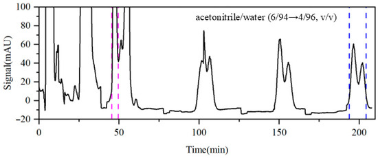 Taking into account the influence of key parameters, including the eluent composition, elution mode, and modifier flow rate on the impurity purification efficiency, solvent consumption, and separation time, Run 4 was identified to offer the optimal separation conditions. Specifically, the initial eluent composition was acetonitrile/water (6:94, v/v), with impurity A (the most readily separable) collected during the second switching cycle. Starting from the third cycle, the eluent was adjusted to acetonitrile/water (4:96, v/v), and the flow rates of the eluent and the modifier (pure water) were set at 5 mL·min−1 and 1 mL·min−1, respectively. The obtained purities of impurities A, B, and C were 97.82%, 91.54%, and 81.56%, respectively. As shown in Figure 9, where the injection volume is 10 μL, the signal peaks for impurities A, B, and C are approximately 423 mAU, 104 mAU, and 53 mAU, respectively. In comparison, the corresponding peaks in Figure 2 (injection volume 1 μL) are all below 10 mAU. This result clearly demonstrates that a significant enrichment of the target impurities was achieved during the recycling process. The final concentrations of impurities A, B, and C in the final collected fractions were increased by 5.6-, 3.2-, and 5.8-fold, respectively, compared to their initial concentrations in the raw material.
