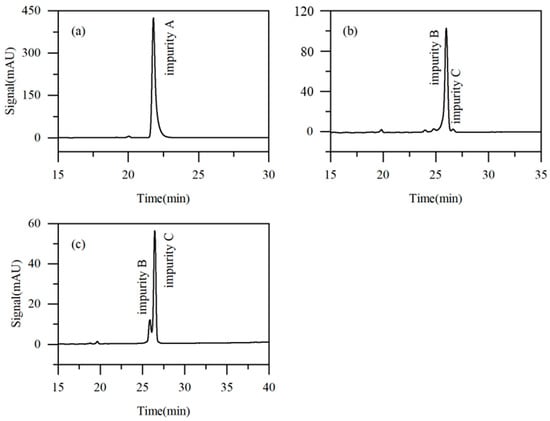 Chromatograms of Run 5 fractions ((a): fraction of impurity A, (b): fraction of impurity B, and (c): fraction of impurity C).