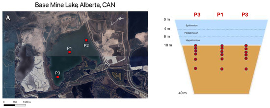 The focus of this study is Base Mine Lake (BML) (Figure 1), the first full-scale PL in the Athabasca Oil Sands Region (AOSR) commissioned by Syncrude, Alberta, Canada in 2012 [5]. As of October 2012, the FFT deposit underlying BML had reached a maximum thickness of 48 m and was submerged under a 52 million m3 water cover, with a surface area of approximately 8 km2 and an average depth of 6.5 m. Settlement and densification of the FFT between 2012 and 2017 resulted in a water cap depth increase to roughly 10.5 m. Freshwater additions, ranging from 2 to 6 million m3, to BML have been undertaken to simulate future water inflow from adjacent reclaimed landforms [2]. Water is currently pumped from the BML water cap for utilization in the oil sands extraction process such that the lake maintains a surface elevation of 308.7 ± 0.5 m above sea level [2]. Field studies beginning in 2015 have extensively characterized the temporal and spatial geochemistry of OCC mobilization from the fluid water interface (FWI) into the overlaying water column [5,6].