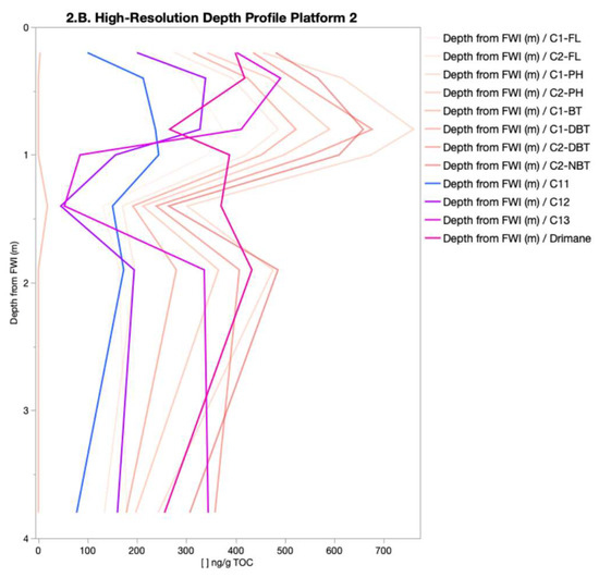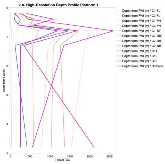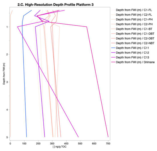 At P1, the site with the highest range of TOC-normalized concentrations, the TOC-normalized concentration of species was generally consistent except for the sample collected nearest the FWI (0.2 m from FWI), which was depleted for most species, except for the n-alkanes (Figure 2A). The subsequent depth interval at 0.4 m from FWI exhibited the largest abundance of species, which was followed by a decrease at 0.6 m and a subsequent increase at 0.8 m from the FWI (Figure 2A). After this fluctuation, the species concentrations generally remained consistent until the deepest samples were at 5.0 m from the FWI.