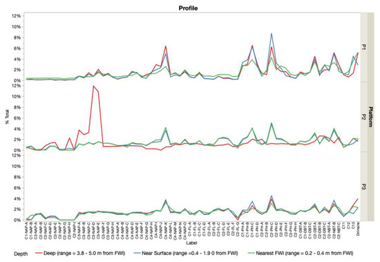 Principal component analysis (PCA, Figure 4) showed that P1 and P2 had distinct signatures that separated from the consistent P3 in PC1 (46% variability) and from each other in PC2 (25% variability). The clustering associated with P1 and P2 depth intervals shared a similar variability in the first principal component, which explained most of the total variance (46%) for isomer concentrations. The two data points from P1 and P2 that were plotted closest to the P3 data were the two most notable outliers in Figure 2. That is, the distinct variability in P1 that was associated with the samples collected nearest the FWI (range = 0.2 m from FWI) and the distinct fingerprint in P2 for the deepest sample (range = 3.8 m from FWI). The similarity between the clustering for these samples and P3 is driven by depleted species concentrations, as illustrated in Figure 3. The samples from P1 and P2 were effectively separated in the second principal component, which explained 25% of the variance. The variability in isomer concentrations driving the directionality of P3 samples in the score plot was strongly influenced by elevated concentrations in two specific isomers (C2-NAP-A and B) compared to the other platforms. The isomer variability in concentration contributing to the separation between P1 and P2 was the elevated concentrations for a subset of lower-molecular-weight isomers (C2-FL and C2-NAP species class) in P2 and the elevated concentration for a subset of C1-BT isomers and drimane in P1. Effectively, the score plot of the PCA determined the relative variability in concentrations between platform species concentrations, while the loading plot affirmed the differences in species variability across the platforms.