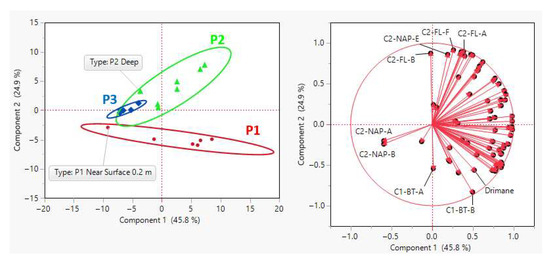 (left) PCA score plot for FFT depth intervals constructed from isomer concentrations and categorized by their respective platforms, with density ellipses representing the 95% confidence interval between clustering groups. Near-surface samples in P1 (range = 0.2 m from FWI) and deepest samples in P2 (range = 3.8 m from FWI) are labelled to illustrate the large separation within their respective platform density ellipses. (right) PCA loading plot for isomers’ influence on principal component separation. C2-NAP-A to B, C2-FL-A, B, F, and C2-NAP-E are labelled to illustrate their distinct characteristic from the rest of the isomers.